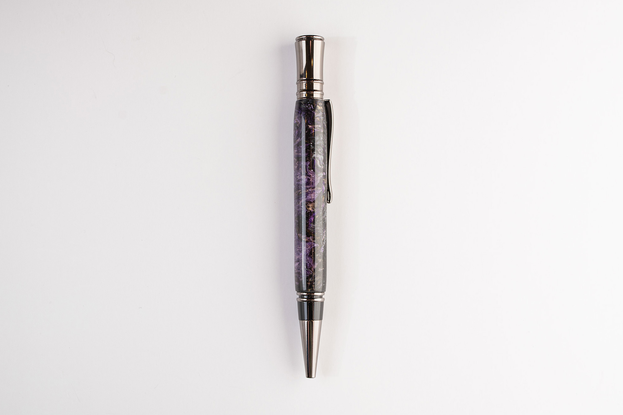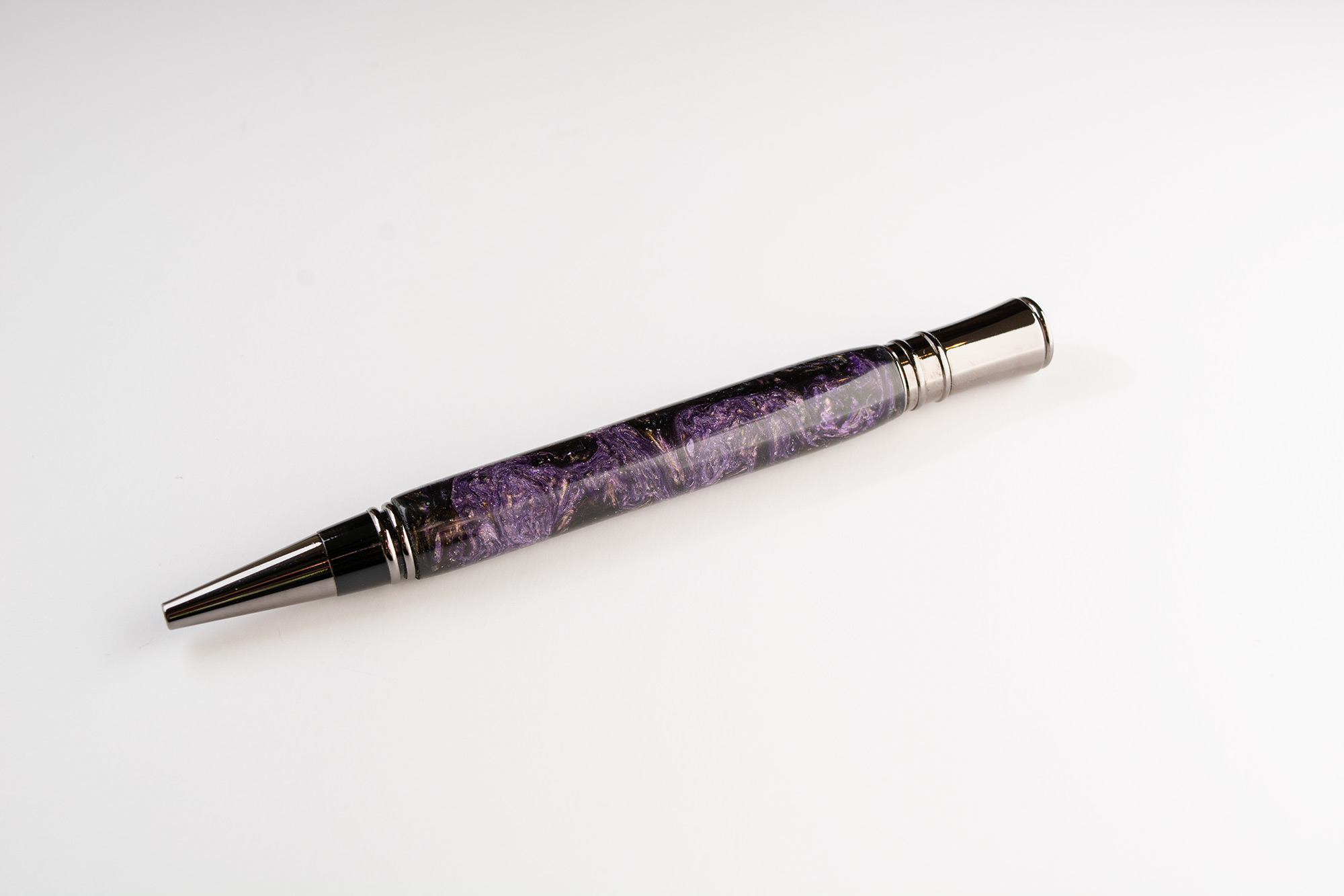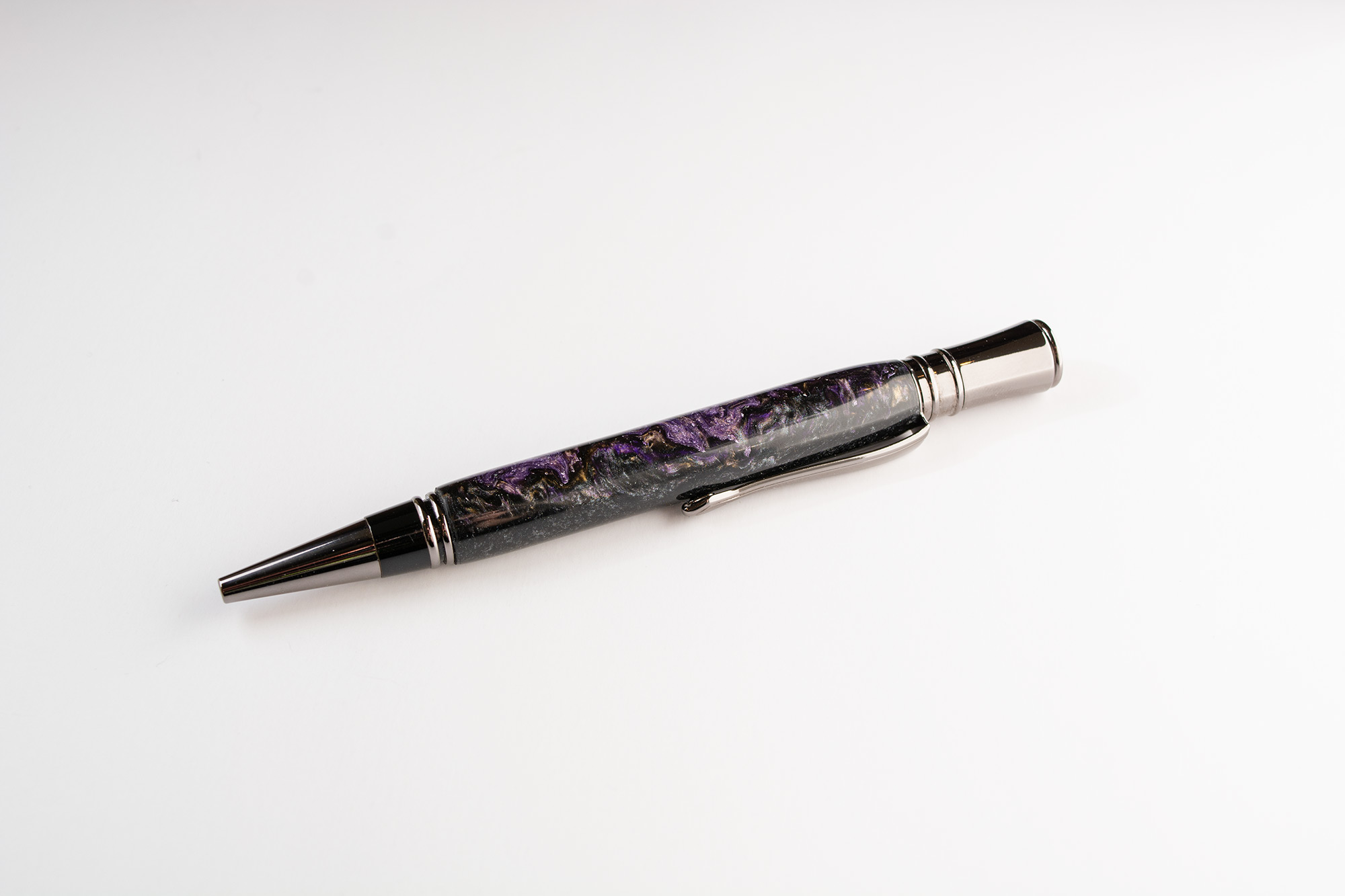 Here is a really cool purple and black with subtle hints of a gold-like color throughout this custom poured epoxy/resin pen. It was polished to a shine and installed on a gun metal twist ballpoint pen.