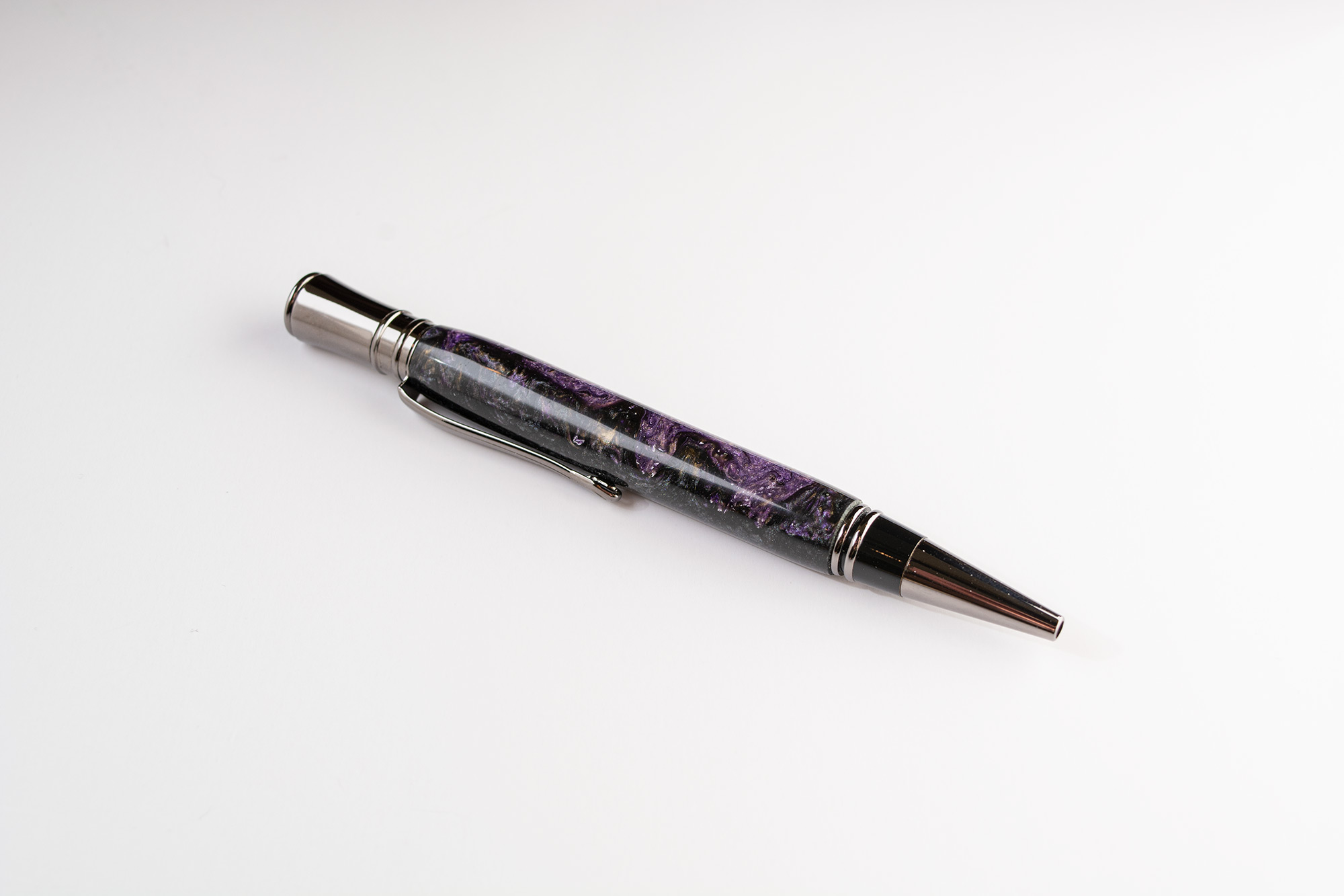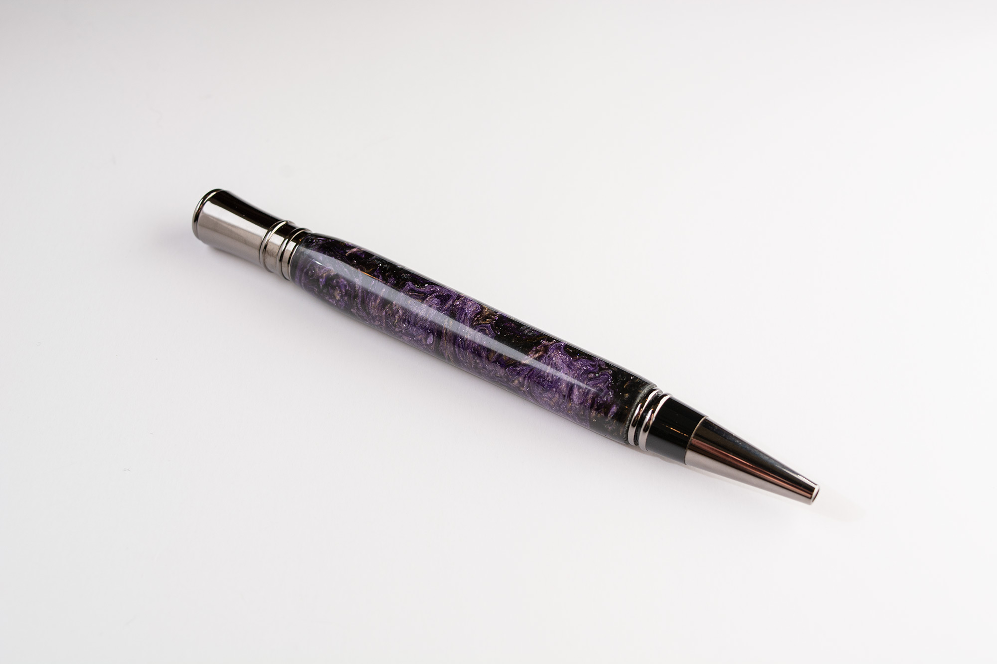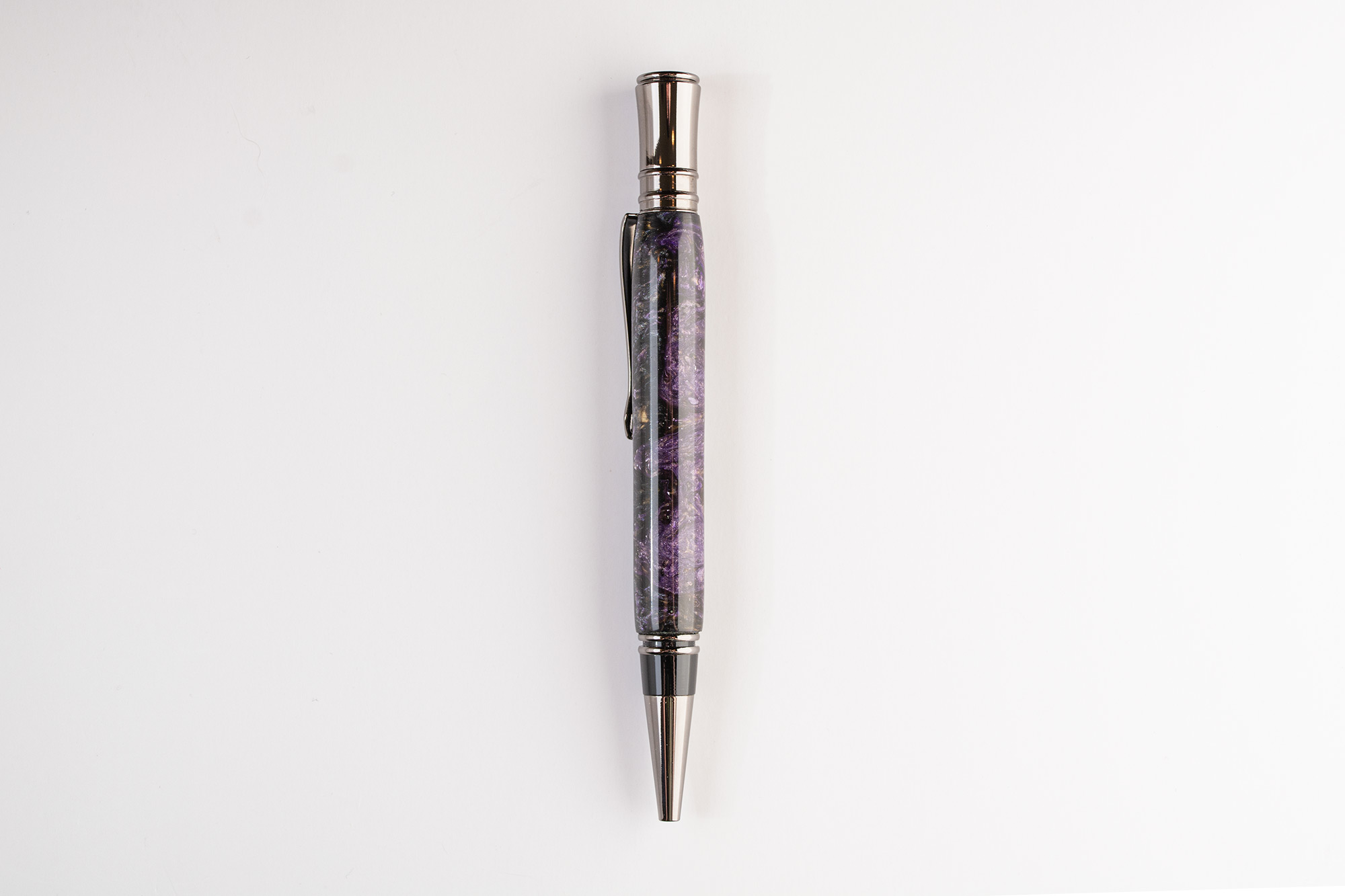 Here is a really cool purple and black with subtle hints of a gold-like color throughout this custom poured epoxy/resin pen. It was polished to a shine and installed on a gun metal twist ballpoint pen.