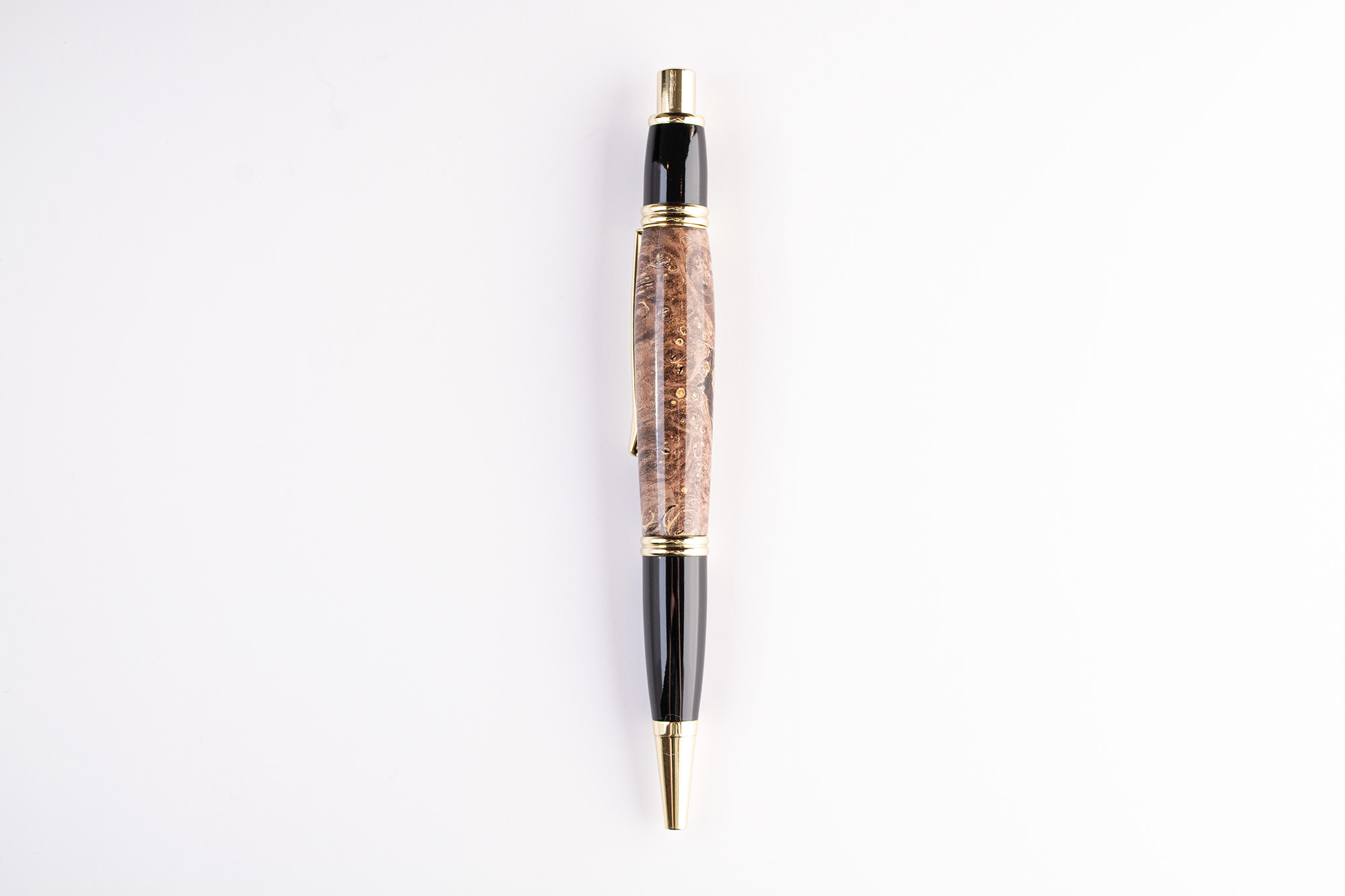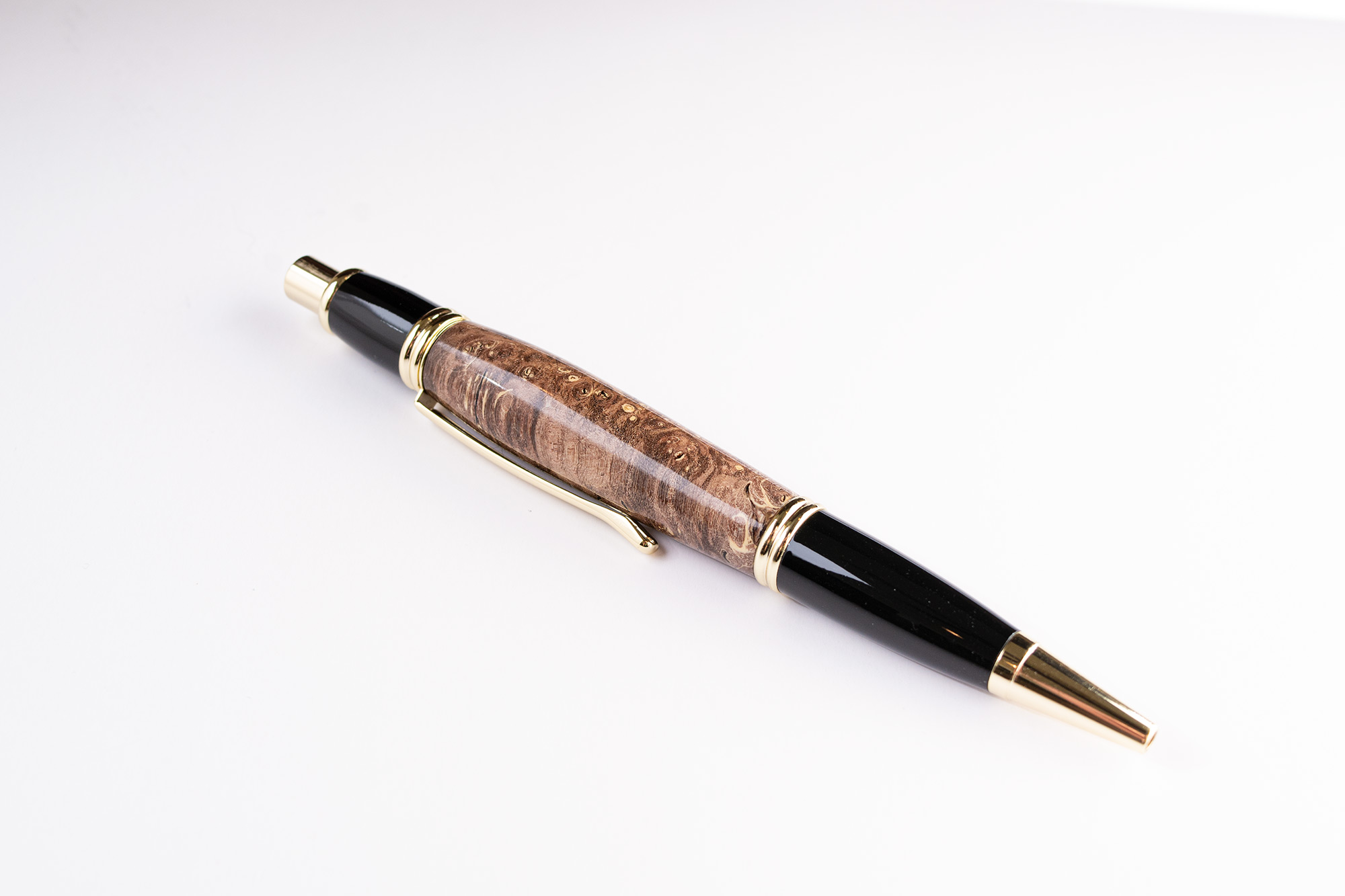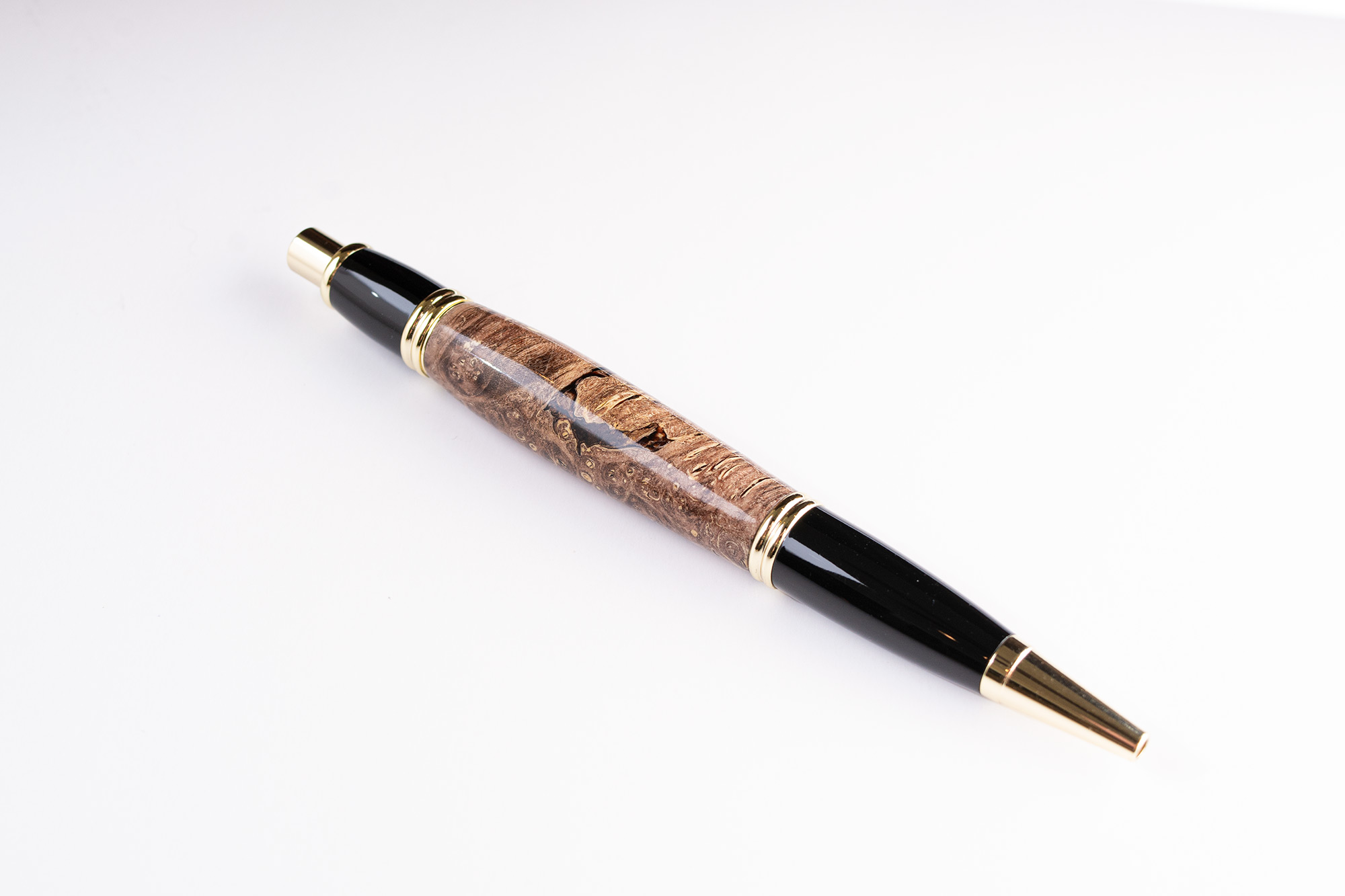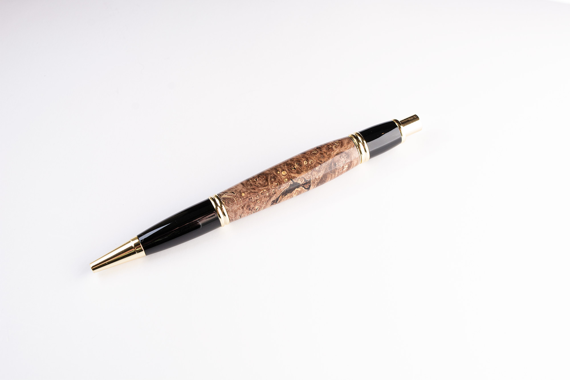 This is a handcrafted Boxelder burl wood and gold click pen, turned and polished to a glossy finish.